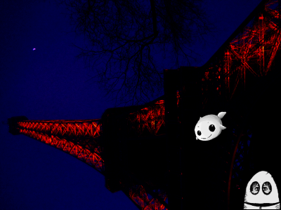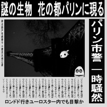 『飲食店連続襲撃事件の容疑者と疑われる謎の白生物がまたもメディアをにぎわせた。所持していたパスポートによると名前はエリスン=ジョッシュ、住所はロンドド郊外。職務質問に対しては「ヒュイヒュイヒュ、ヒュイ」「ヒュイー!」「ヒュュユィー、ヒュウー」 などと答えたという。また、この写真に偶然映りこんだ男は先日ロンドドのメインストリートに現れた着ぐるみ男である可能性が高く、当局でも確認を急いでい る。(撮影アルミンヌ)』